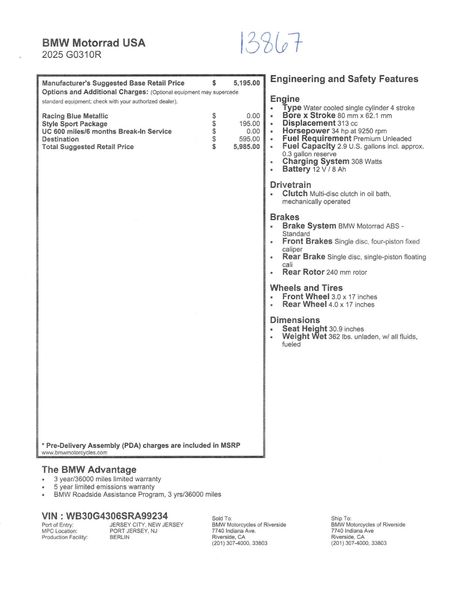 2025 G310R in Racing Blue Metallic. Well equipped with standard features including ABS, ride-by-wire throttle, and Ultimate Care Break-In Service. Financing available O.A.C.  Stop in or call Sales today 951-353-0607.