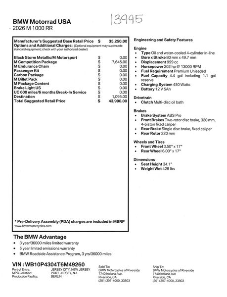2026 M1000RR. Competition Package. Carbon Fiber Wheels, M Billet Pack, Carbon Package, Gear Shift Assist Pro, Heated Grips, Cruise Control and more. Financing available O.A.C.