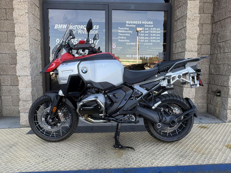 2026 R1300GS Adventure in Racing Red. Equipped with Adaptive Height Control Comfort, Gear Shift Assist Pro, Comfort Rider's Seat, Premium, Touring and Dynamic Packages which include Sports Brake, Ride Modes Pro, Headlight Pro, Riding Assistant, Heated Seats, LED Auxiliary Lights, Topcase Carrier and more. Financing available O.A.C.
