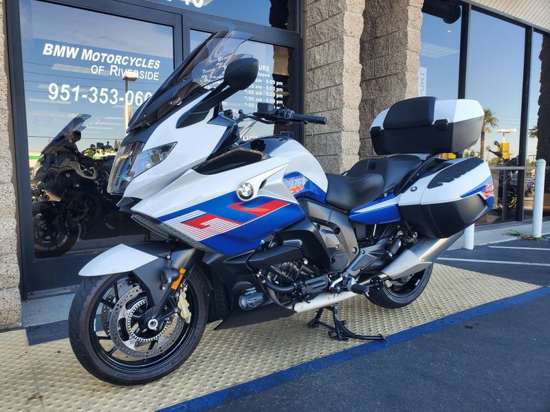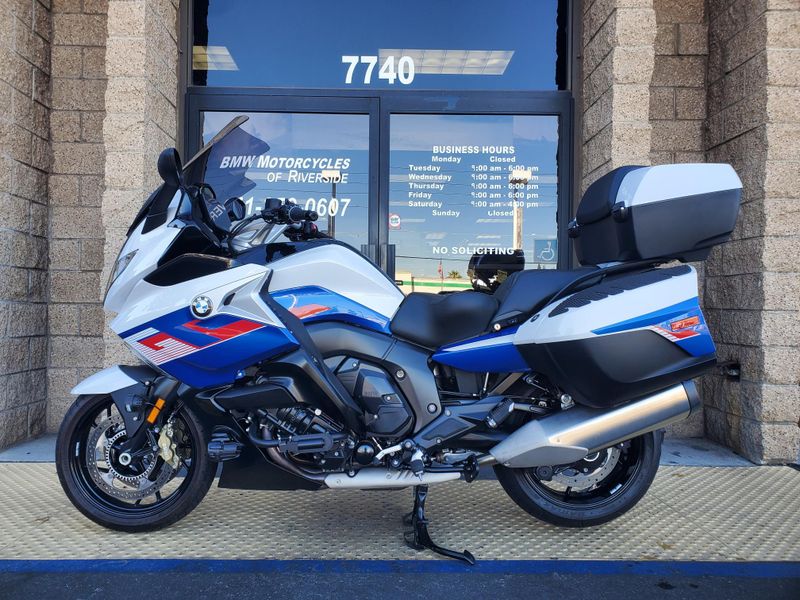 2022 K1600GT in Light White and Racing Blue. Equipped with the Comfort and Touring Packages which include Reverse Assist, Keyless Ride, LED Auxiliary Lights, Cruise Control, Heated Grips, Gear Shift Assist Pro, Floor Lighting and more. Additional accessories include heated Russell seats, tall tinted windshield, Ilium protection bars with highway pegs, Clearwater Auxiliary Lights and OEM top case with additional brake light. Financing available O.A.C.