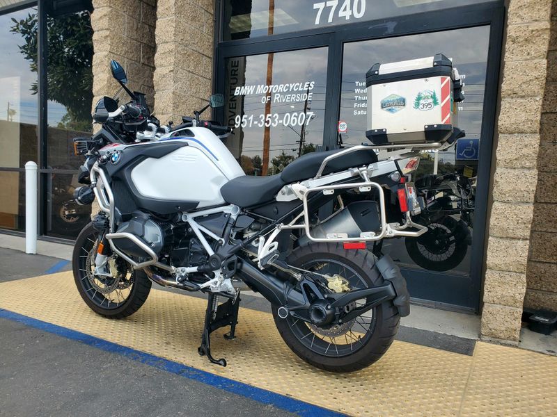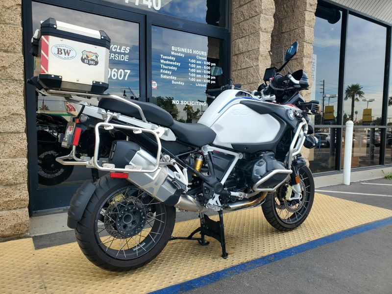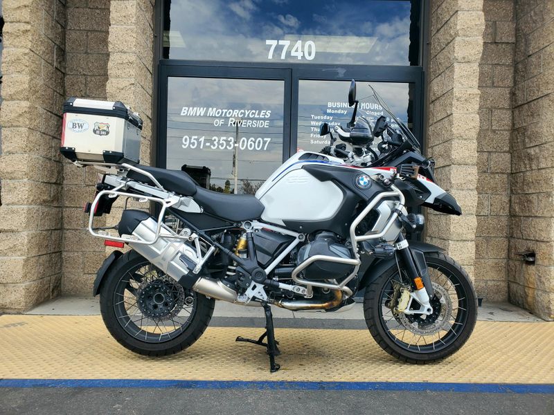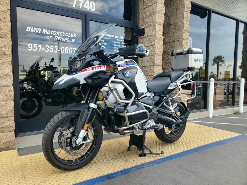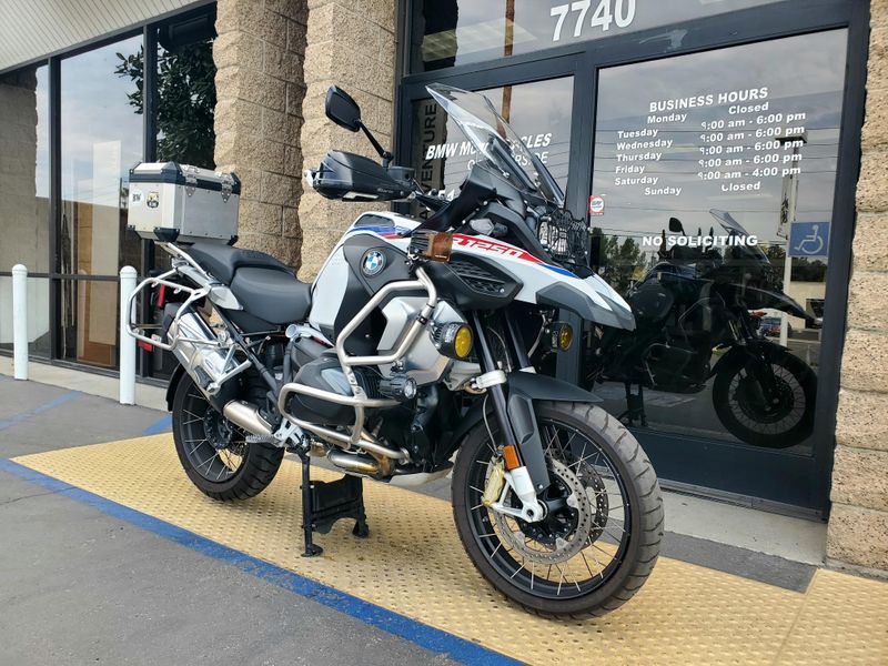 2023 R1250GS Adventure in the Rally Package. Premium Package motorcycle with halogen headlight includes Keyless Ride, Dynamic ESA, Gear Shift Assist Pro, Heated Grips, TPM, Cruise Control, Ride Modes Pro and LED Auxiliary Lights. OEM Topcase, Clearwater & Denali driving lights, and Barkbuster handguards installed. Financing available O.A.C.